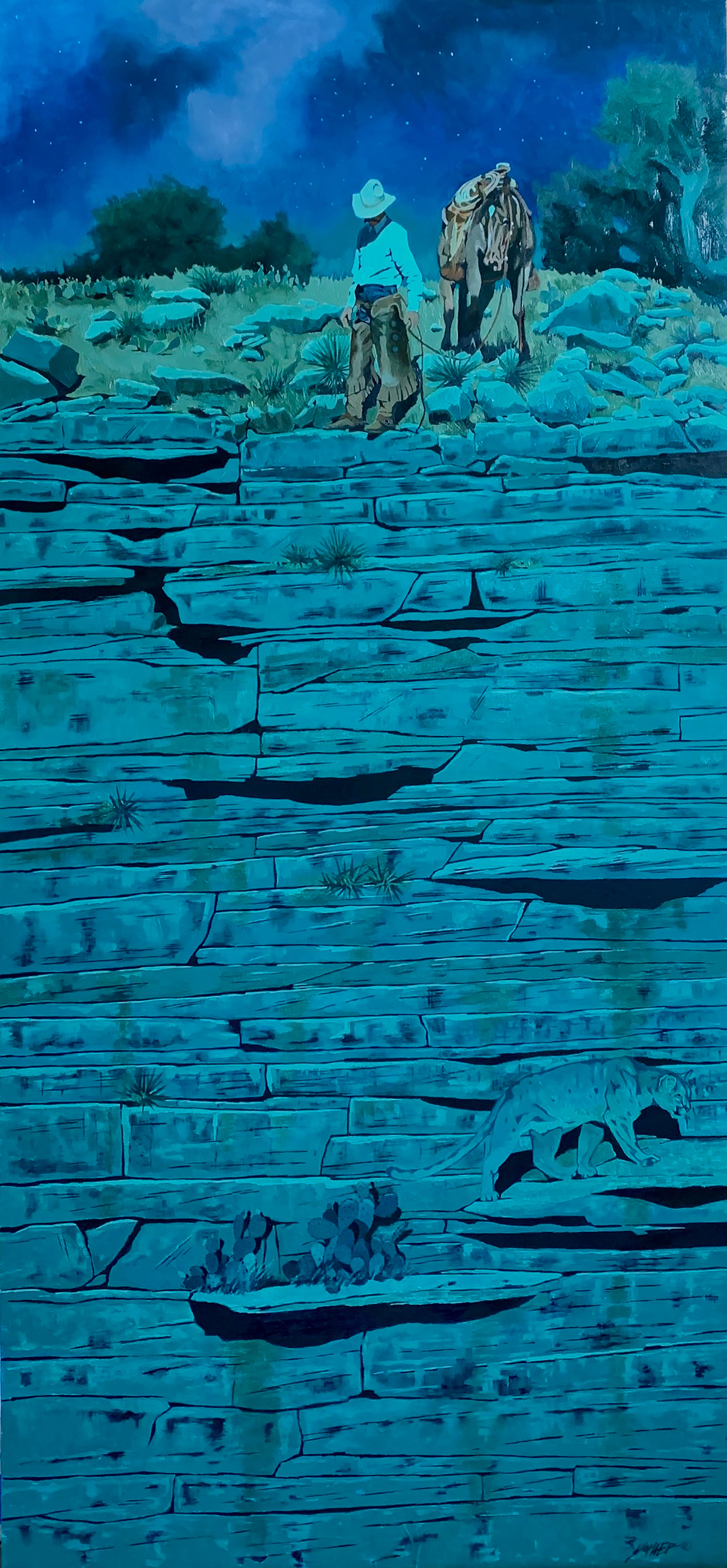 Oil on aluminum panel. 30 x 14 in., Framed dimensions: 38 x 22 in.